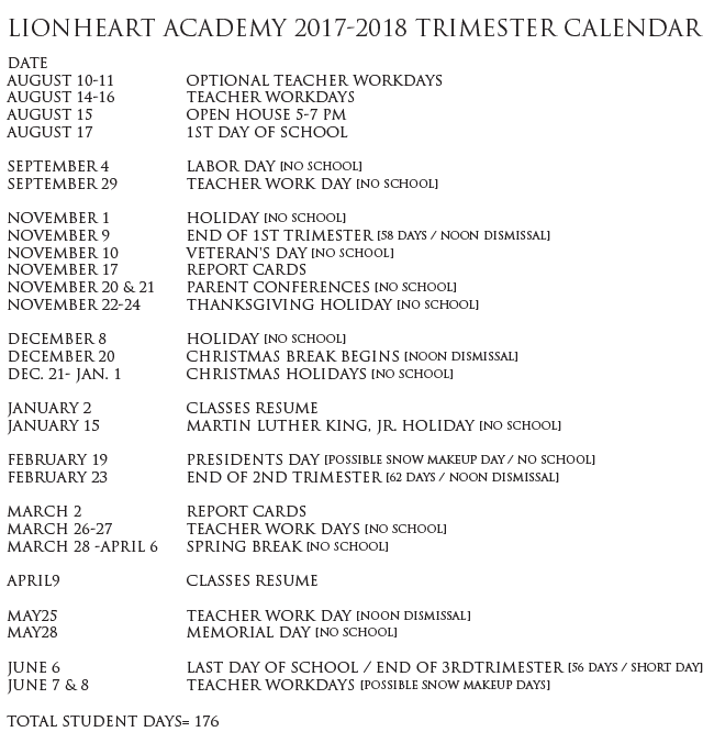 Lionheart offers a smaller school environment and classroom sizes of 15 students with one lead teacher and one assistant teacher.